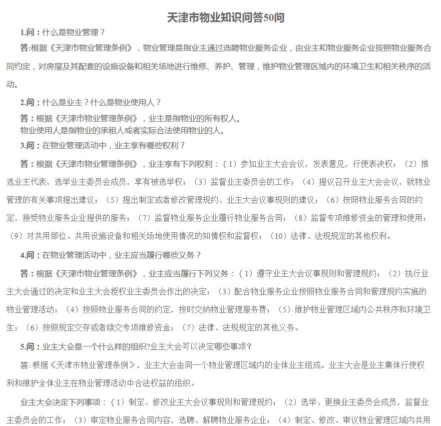 天津市物業(yè)知識問答50問1.問:什么是物業(yè)管理?答:根據(jù)《天津市物業(yè)管理條例》,物業(yè)管理是指業(yè)主通過選聘物業(yè)服務(wù)企業(yè),由業(yè)主和物業(yè)服務(wù)企業(yè)按照物業(yè)服務(wù)合同約定,對房屋及其配套的設(shè)施設(shè)備和相關(guān)場地進行維...