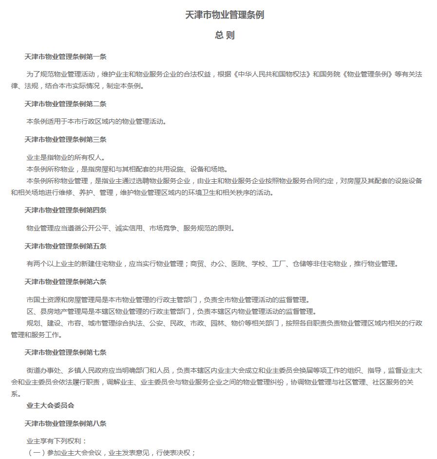 天津市物業(yè)管理條例總 則天津市物業(yè)管理條例第一條為了規(guī)范物業(yè)管理活動,維護業(yè)主和物業(yè)服務(wù)企業(yè)的合法權(quán)益,根據(jù)《中華人民共和國物權(quán)法》和國務(wù)院《物業(yè)管理條例》等有關(guān)法律、法規(guī),結(jié)合本市實際情況,制定本條...