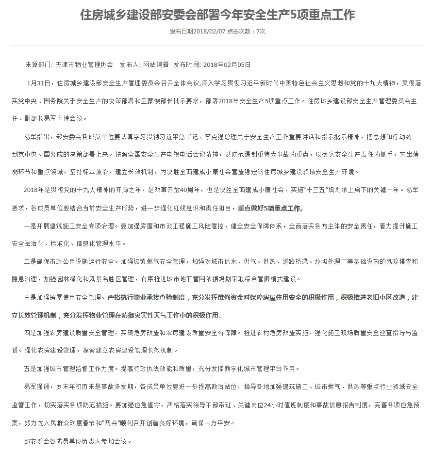 來源部門: 天津市物業(yè)管理協(xié)會 發(fā)布人: 網(wǎng)站編輯 發(fā)布時間: 2018年02月05日 1月31日,住房城鄉(xiāng)建設(shè)部安全生產(chǎn)管理委員會召開全體會議,深入學(xué)習(xí)貫徹習(xí)近平新時代...