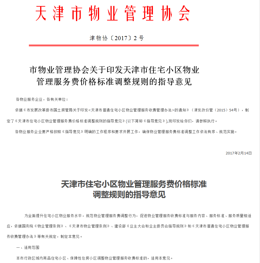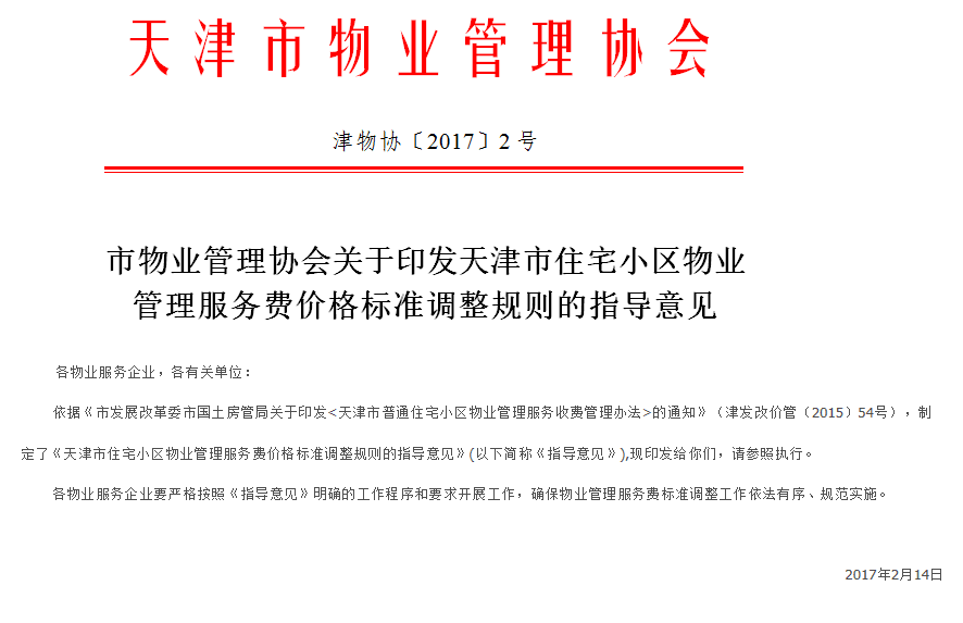 來源部門: 天津市物業(yè)管理協(xié)會 發(fā)布人: 網(wǎng)站編輯 發(fā)布時間: 2017年02月14日 各物業(yè)服務(wù)企業(yè),各有關(guān)單位: &n...